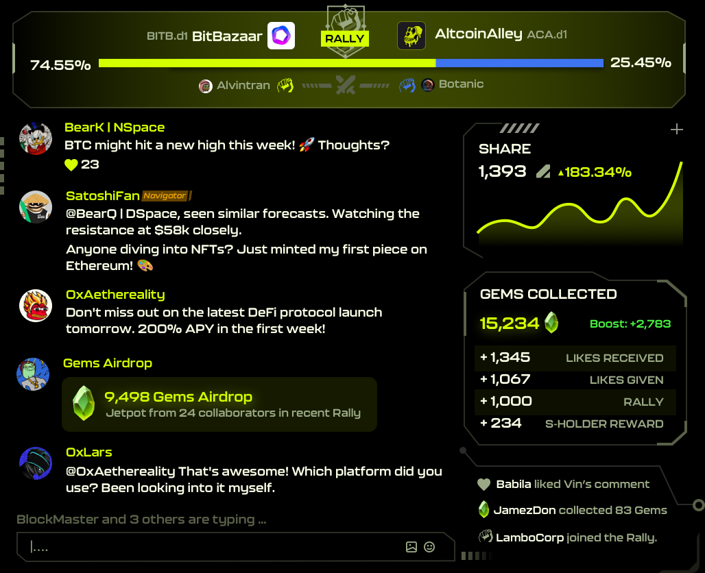 Participate in one of the three daily rally sessions to support your favorite space and collect gems. Keep your eyes peeled for the grand gem drop.Bet on Space’s Success